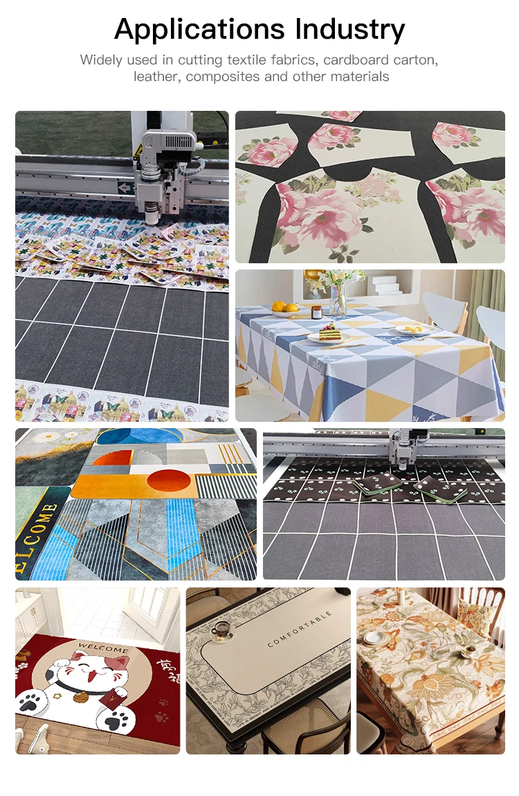 Typical Industry Applications:Apparel Manufacturing: Efficiently cuts suits. knitwear. lace. and complex fabrics; supports pattern-matching layouts to enhance premium garment quality.Automotive Interiors: Precision cutting of seat fabrics. carpets. and PVC mats with burr-free edges. meeting automotive industry standards.Home Textiles: Multi-layer cutting for sofa fabrics. curtains. and rugs; strong vacuum adsorption prevents material shifting.Composite Material Processing: Damage-free cutting of carbon fiber prepreg. aramid. and specialty materials. avoiding delamination or thermal deformation.