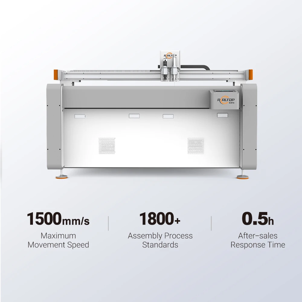 REALTOP CNC cutting machine uses a high-precision digital cutting system. which can realize full size cutting. kiss cutting. slot milling.